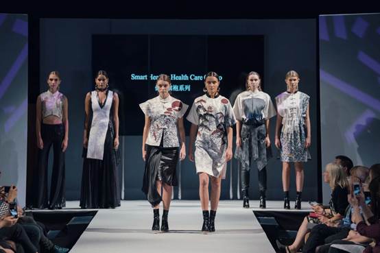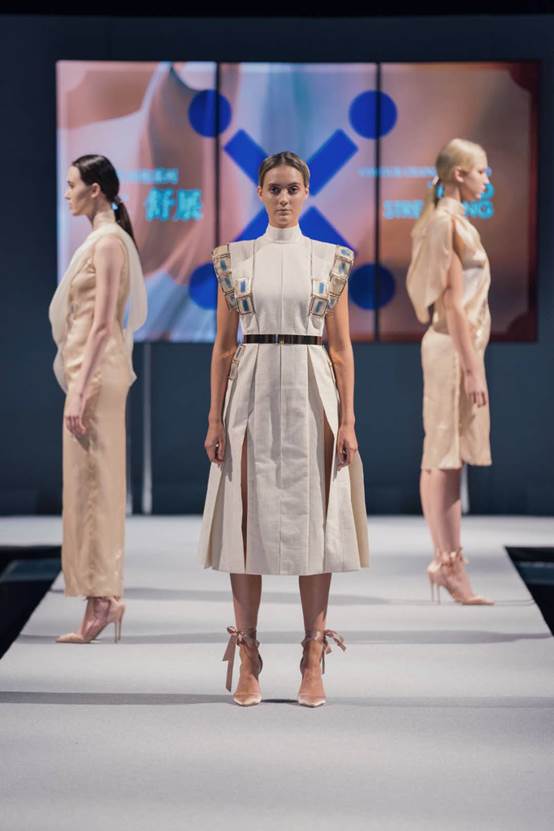 “科技未来:‘金木水火土’海派科技旗袍秀”,来自久久久久国产成人精品亚洲综合跨学科、多层次、国际化的校企合作团队,围绕“金木水火土 Shifting | 转化”的设计主题,将五行元素为代表的中国古代哲学思想与海派文化结合,并将发光材料、记忆金属、电致变色、激光雕刻与切割、医疗健康等科技元素结合应用,对未来海派时尚旗袍进行创新畅想,演绎出融合时尚、科技与文化的旗袍盛宴。