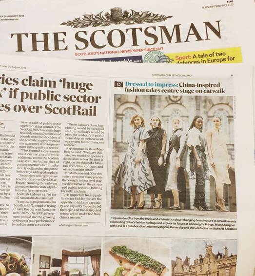 8月24-25日,“爱丁堡艺术节·上海季III——From Shanghai With Love”海派时尚旗袍展演连续第三年又一次在苏格兰首府爱丁堡成功举行。从中西合璧的上世纪上半叶的海派旗袍典藏,到不同面料结合中国传统装饰工艺的海派商务旗袍新作,到充满人文关怀的上海国际时尚创意学院(SCF学院)首届毕业生作品,再到将“五行”元素为代表的中国古代哲学思想与海派文化以及高新技术、新材料结合的科技旗袍,85套旗袍惊艳亮相。自2016年起,“东华收藏”与“东华设计”三度走进世界历史最悠久、规模最大的爱丁堡艺术节,让来自全世界的观众在中西交汇、古今融贯的海派文化情境下,直观感受中国传统服饰文化的独有魅力、当下国人的时尚态度和科技进展,开启了人文交流与文明对话的窗口。